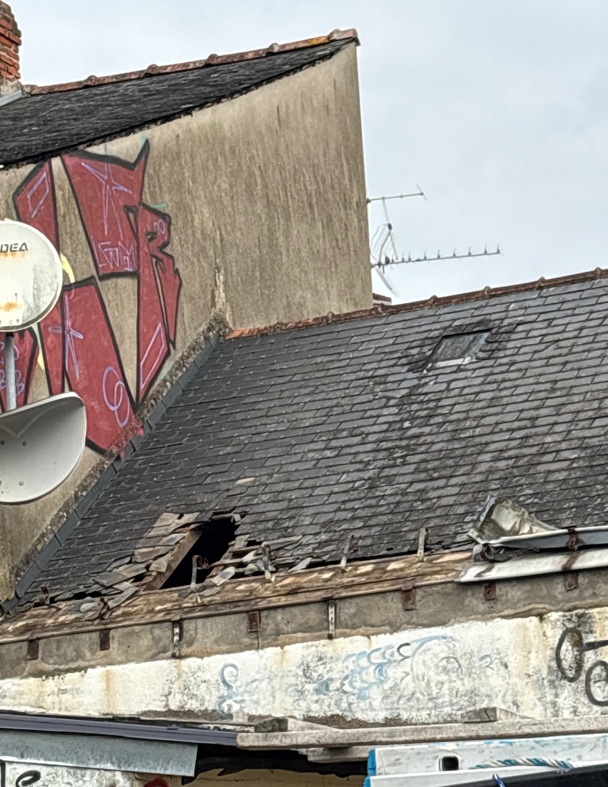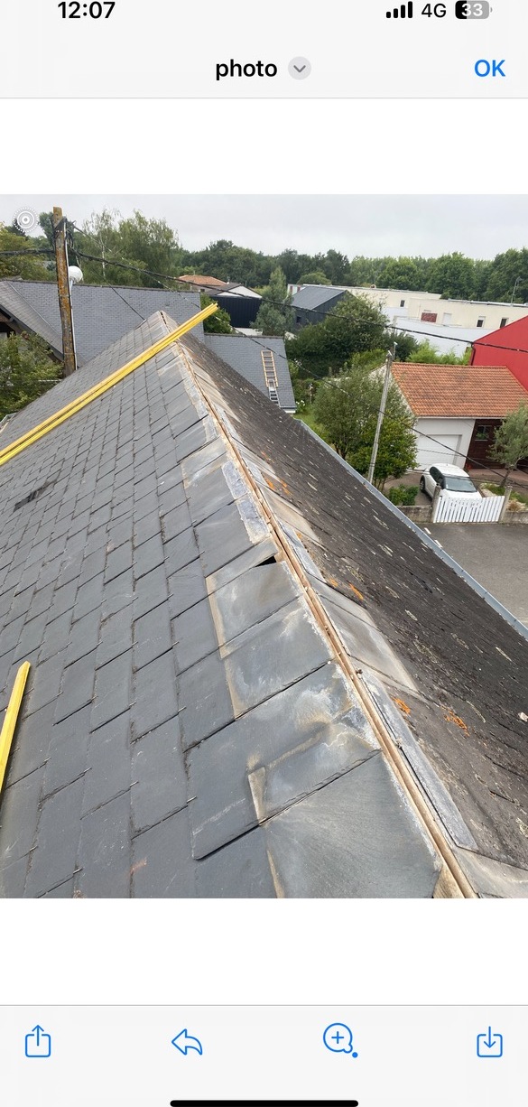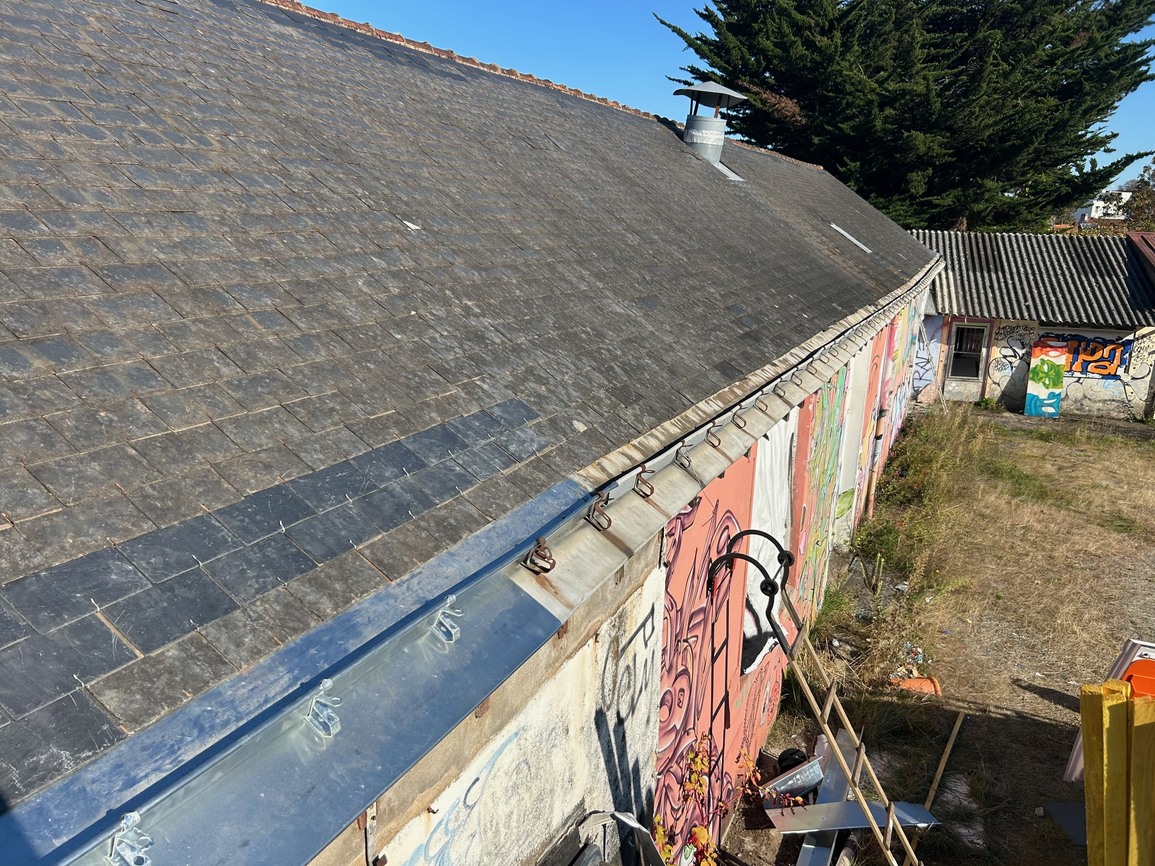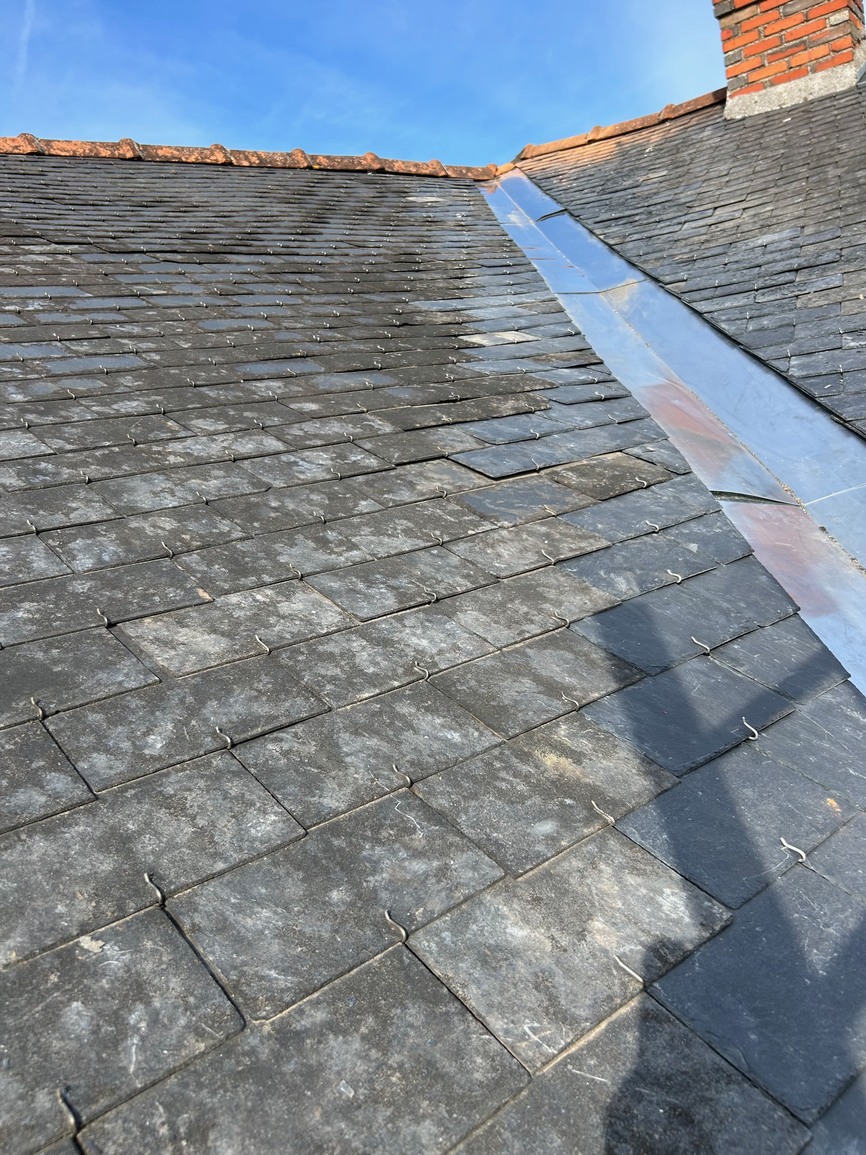 Remplacement de gouttière arrachée, changement de 400 ardoises, réparation de noue en zinc